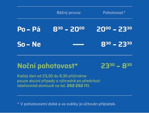 Od půlnoci do 8:30 přijímáme pacienty pouze po předchozí telefonické domluvě, dveře na kliniku jsou v této době uzavřeny.